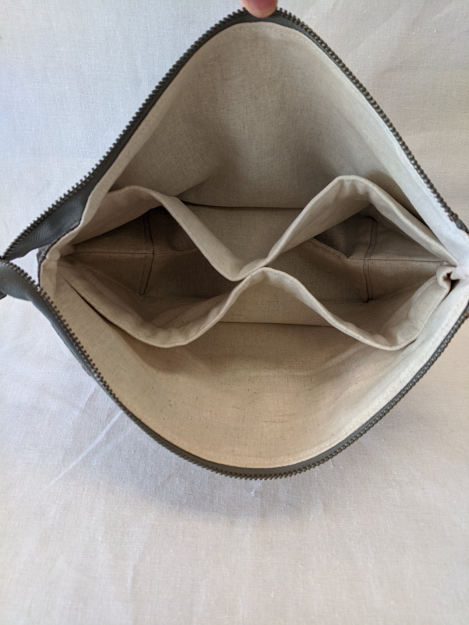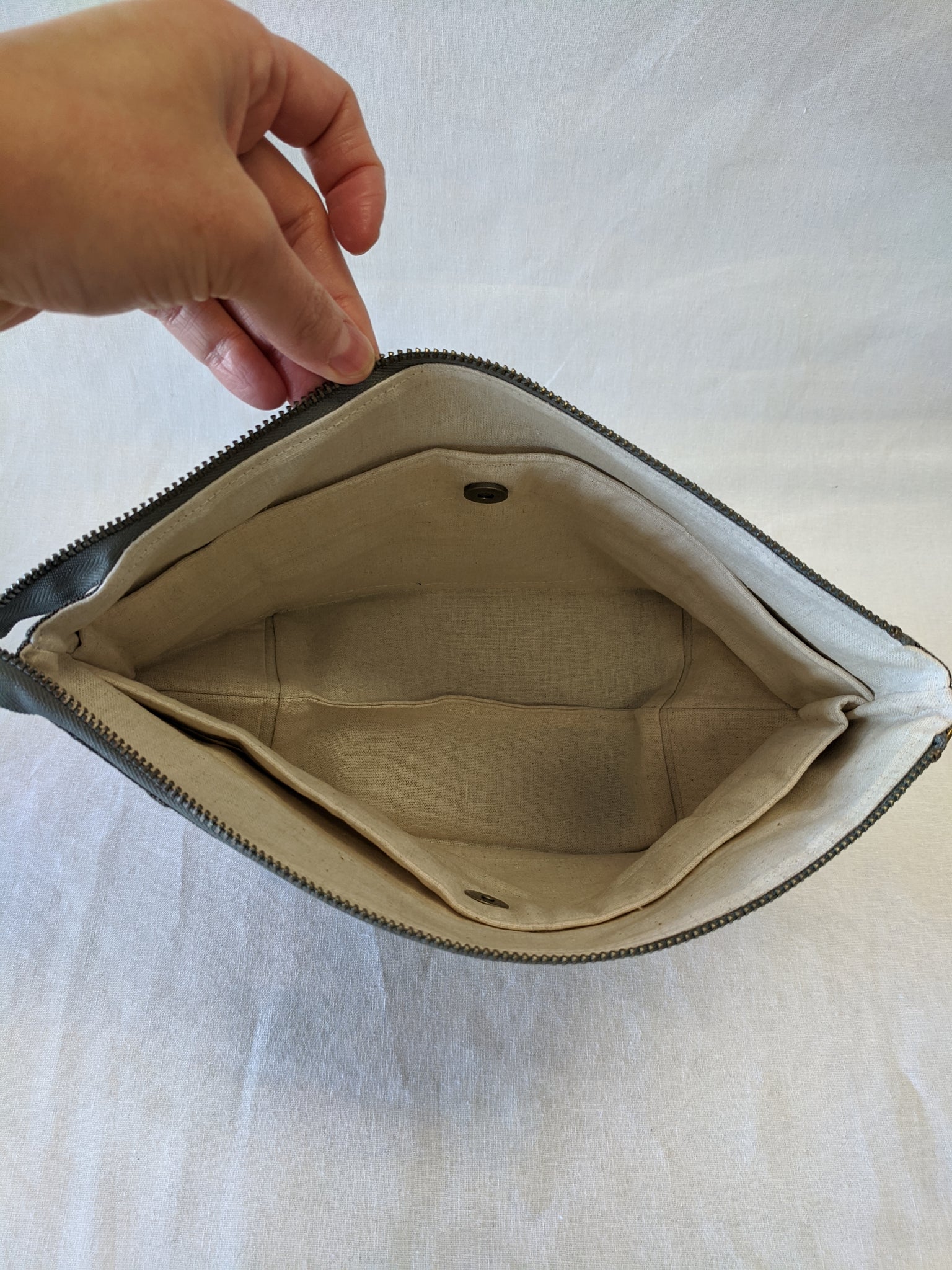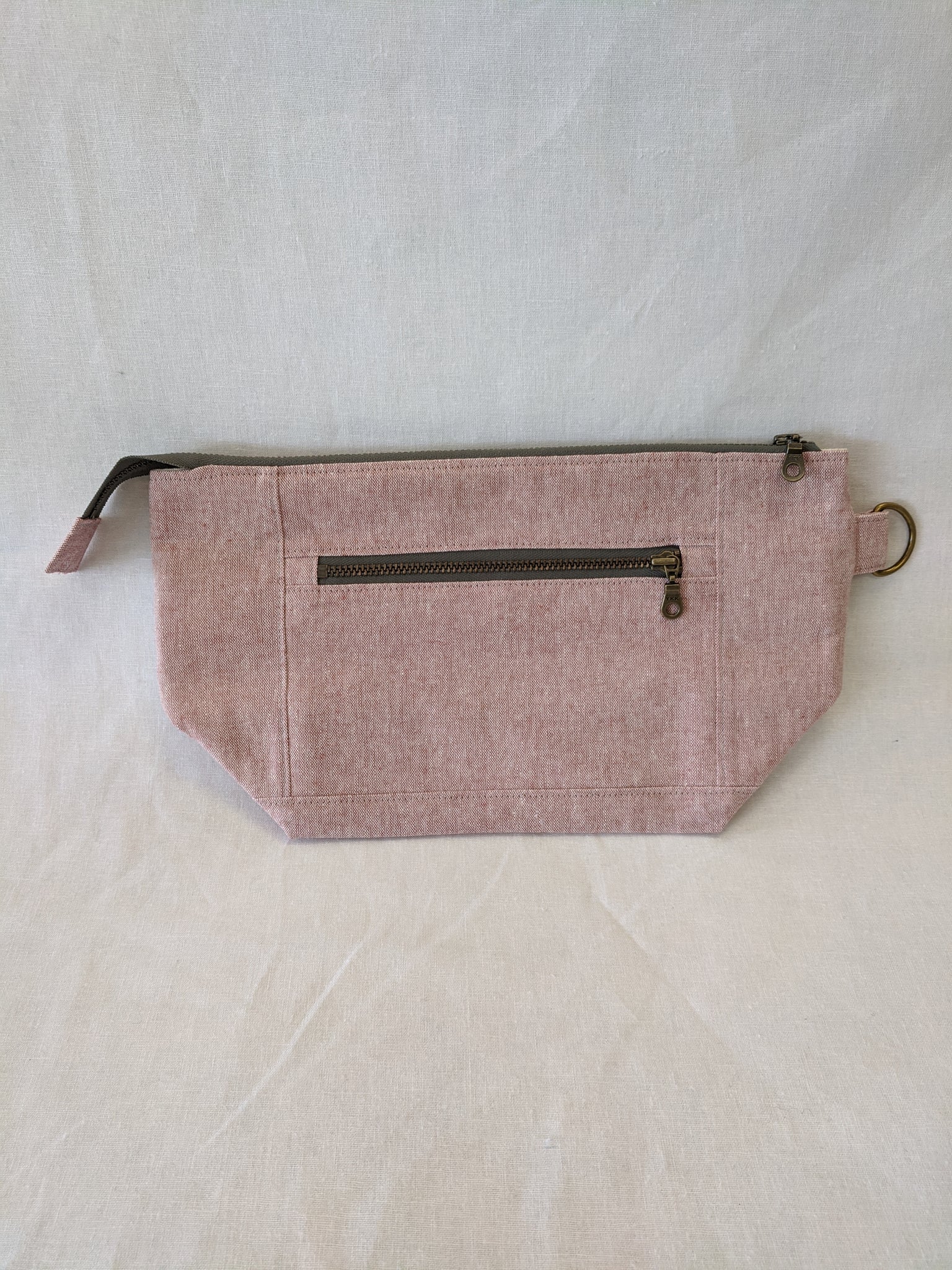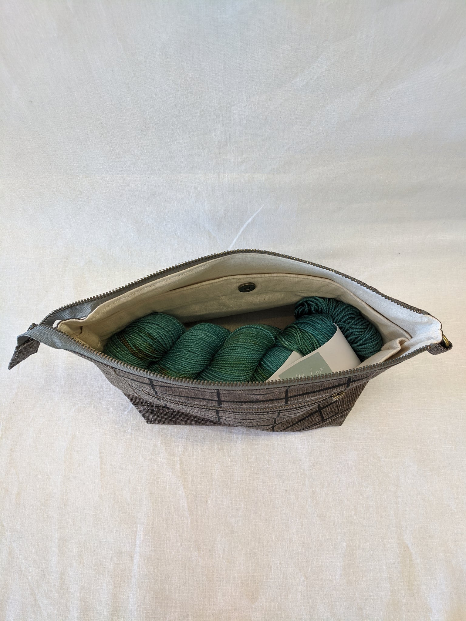 Fully lined with no exposed seams. Made with high quality, sturdy linen/cotton lightweight canvas. Zippers and all findings are solid metal with an antiqued brass finish. Spot clean or machine wash and lay flat to dry, iron as needed to smooth and restore shape. Some shrinking may occur on first washing.