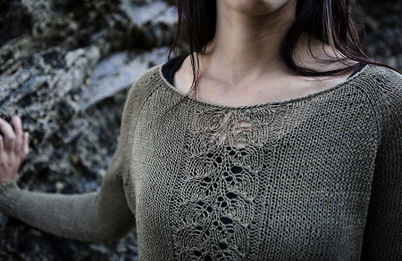 Materials Used: Yarn: 5 (6, 6, 7, 7, 8, 8, 9, 10) skeins of Sparrow by Quince and Co (100% Linen; 168 yards [154 m]/50g) or approx. 805 (890, 960, 1060, 1110, 1210, 1310, 1430, 1600) yards [740 (815, 880, 970, 1015, 1120, 1200, 1310, 1460)m] or fingering weight linen yarn or a similar plant based fiber. The sample was knit using the color Fen.
