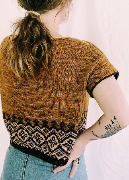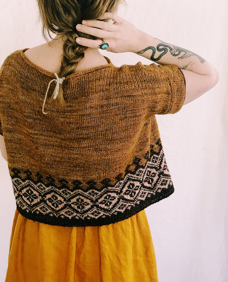 Navelli is a relaxed lightweight summer sweater, knit in the round from the bottom up and featuring colorwork at the body hem and folded sleeves with a tiny peek of contrast color for visual and structural interest. The front and back are separated at the armholes and worked flat with short row shaping at the shoulders. Named for an ancient town in Italy, known as the land of crocuses and saffron, this sweater is the third in my “Knitaly” series of designs (following Tegna and Marettimo).