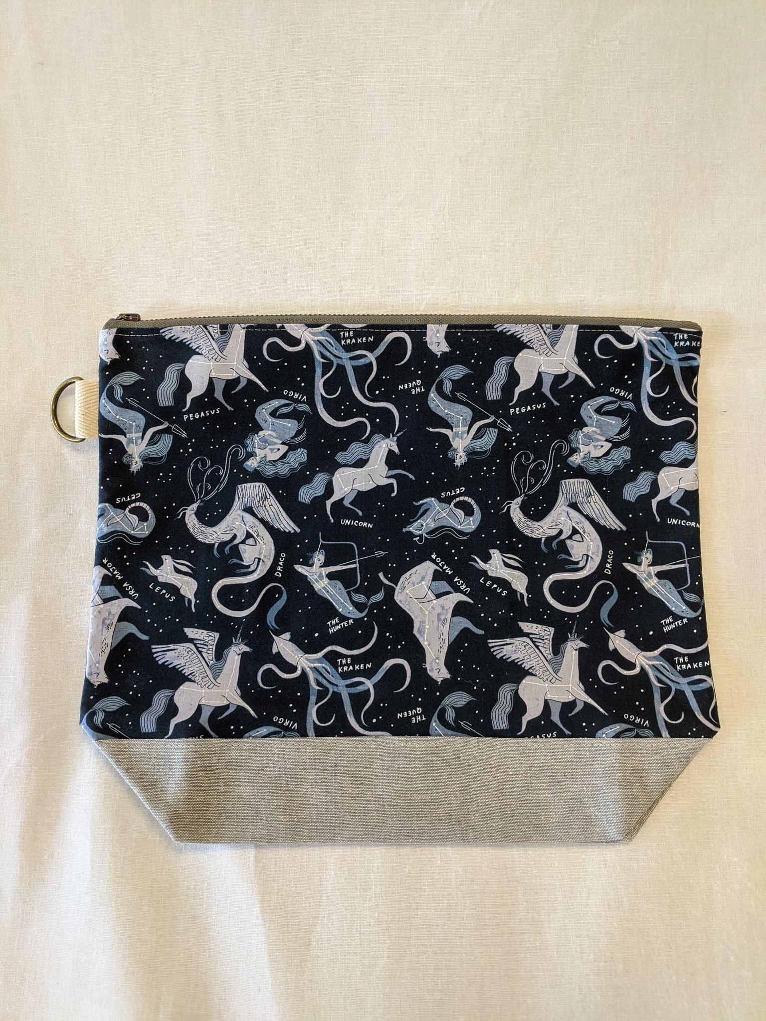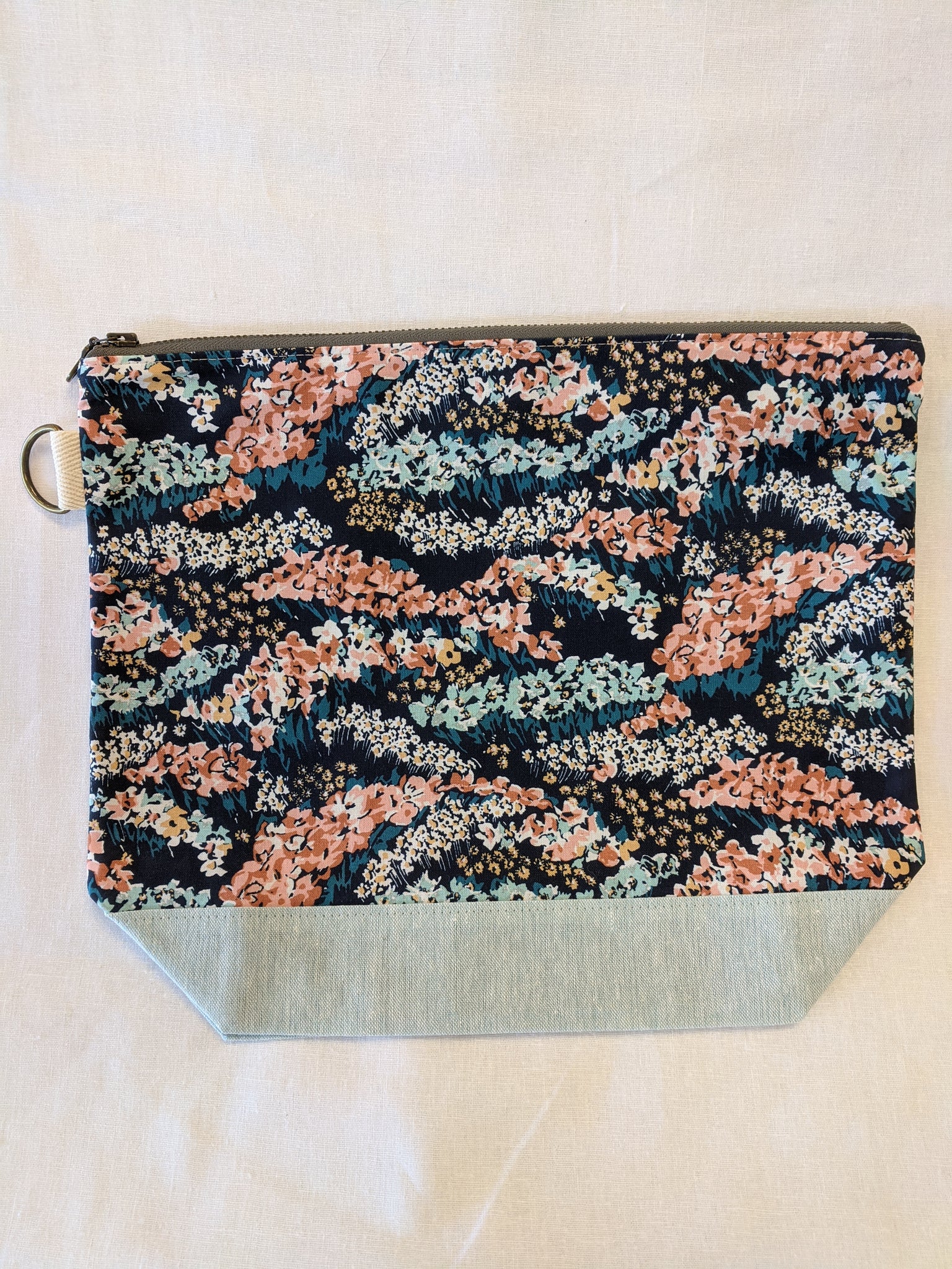 This fully-lined pouch keeps your belongings contained and organized. Perfect for toiletries, diapers and wipes, or as a project bag. Exterior D-ring can be used to hold your keys or attach to a tote or notions bag, or a wrist-strap for carrying on the go. Interior slip pocket to keep small essentials accessible and easy to find.