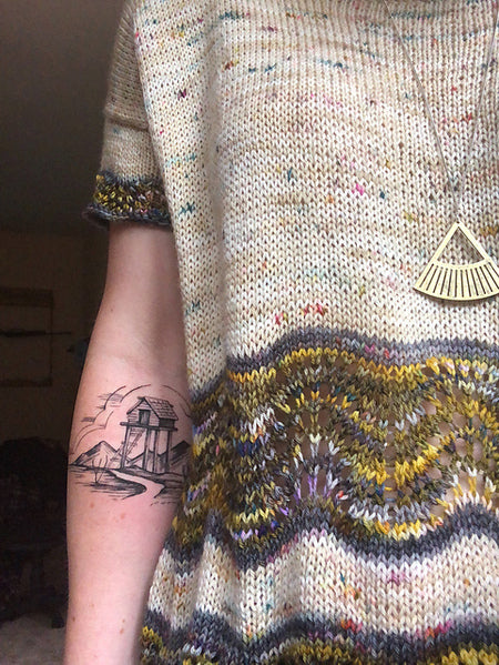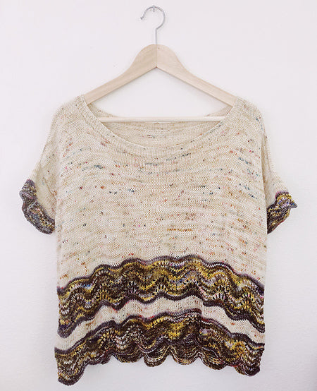 Marettimo is a relaxed lightweight summer sweater, knit in the round from the bottom up and featuring a simple feather and fan lace detail at the hem and sleeves. The front and back are separated at the armholes and worked flat with short row shaping at the shoulders. Named for a small island off the coast of Sicily, this sweater is the second in my series of designs (Tegna is the first) named for Italian towns where I dream of wearing them someday.