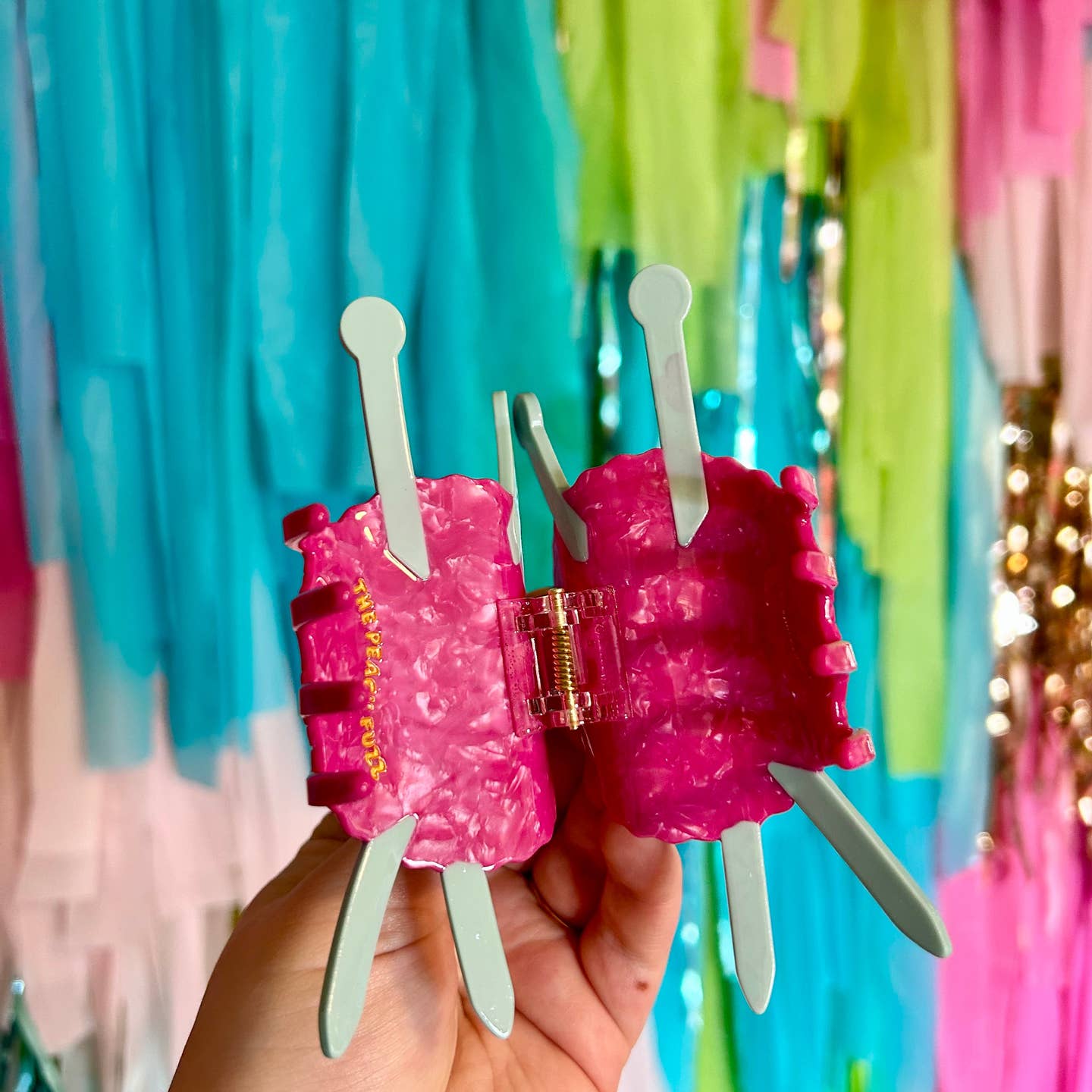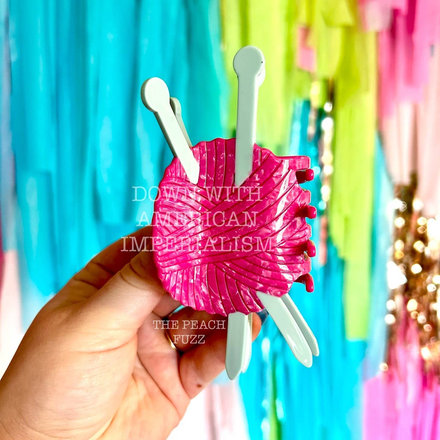 No more using knitting needles as hair picks! I've got a hairclaw perfect for keeping your hair up while hard at work on your yarn ball crafts! Product testers have said this hair clip “does not budge” and “held all day” without pulling or being too tight. High quality. High hold. High camp. Love that for you. Measures 4.5 inches tall, with claw part measuring 2 inches tall and 2.5 inches wide. Made of cellulose acetate (eco friendly!)