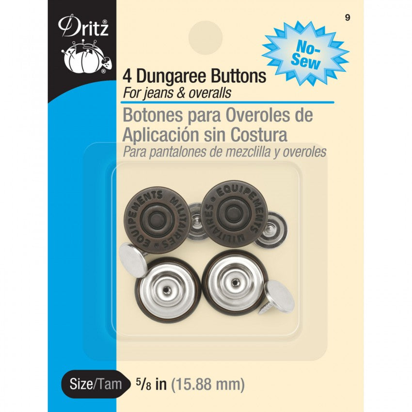 No-sew shank button with pivot tack that holds button in place. For dungarees, jeans, overalls and sportswear. Four no-sew buttons for use in jeans or overalls, garments, accessories, and home decor. May be washed or dry cleaned.