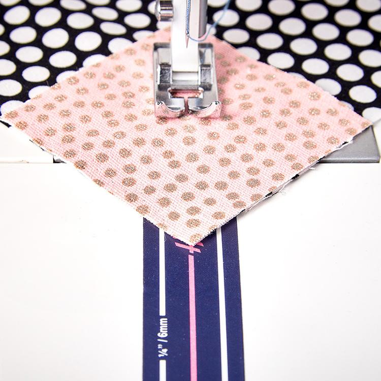 Self adhesive washi tape. Simply cut and stick on your sewing machine centering the pink line with your needle. Use the white lines for a perfect 1/4" seam. Ideal for sewing half square triangles and flying geese. 13/16" x 10.9' roll.