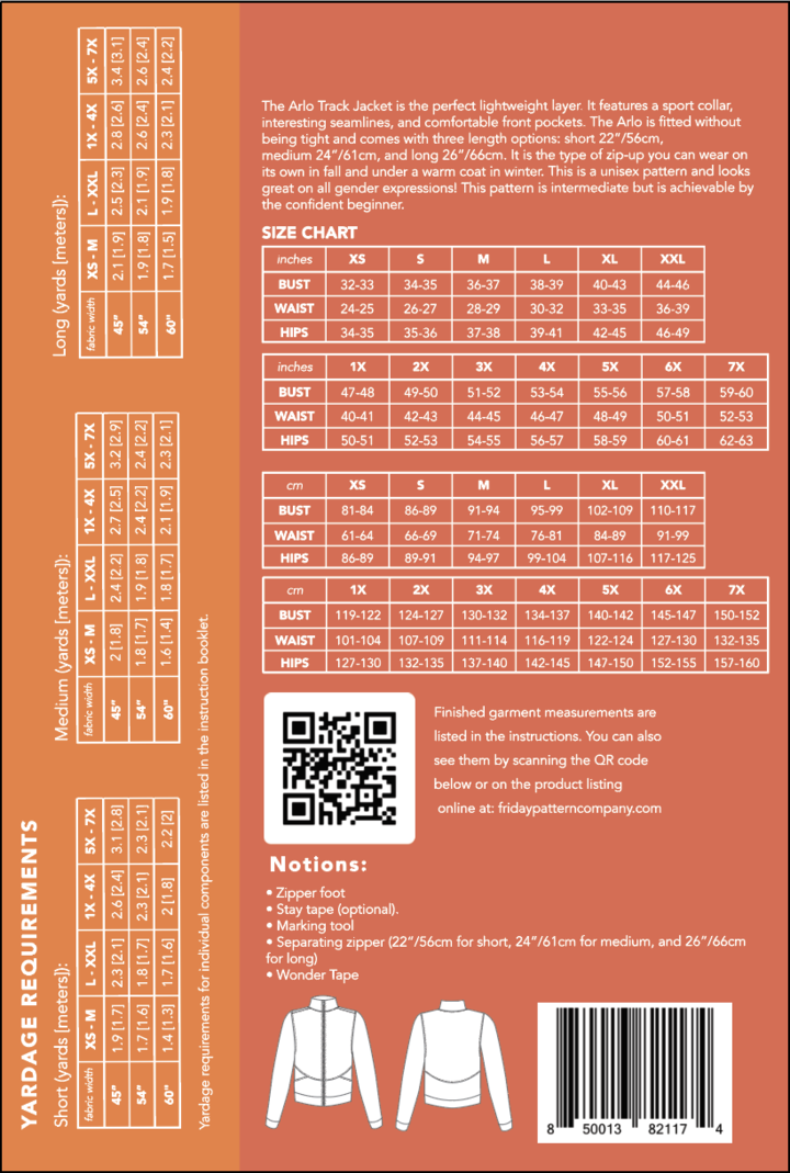 The Arlo Track Jacket is the perfect lightweight layer. It features a sport collar, interesting seamlines, and comfortable front pockets. The Arlo is fitted without being tight and comes with three length options: short 22”/56cm, medium 24”/61cm, and long 26”/66cm. It is the type of zip-up you can wear on its own in fall and under a warm coat in winter. This is a unisex pattern and looks great on all gender expressions! This pattern is intermediate but is achievable by the confident beginner.