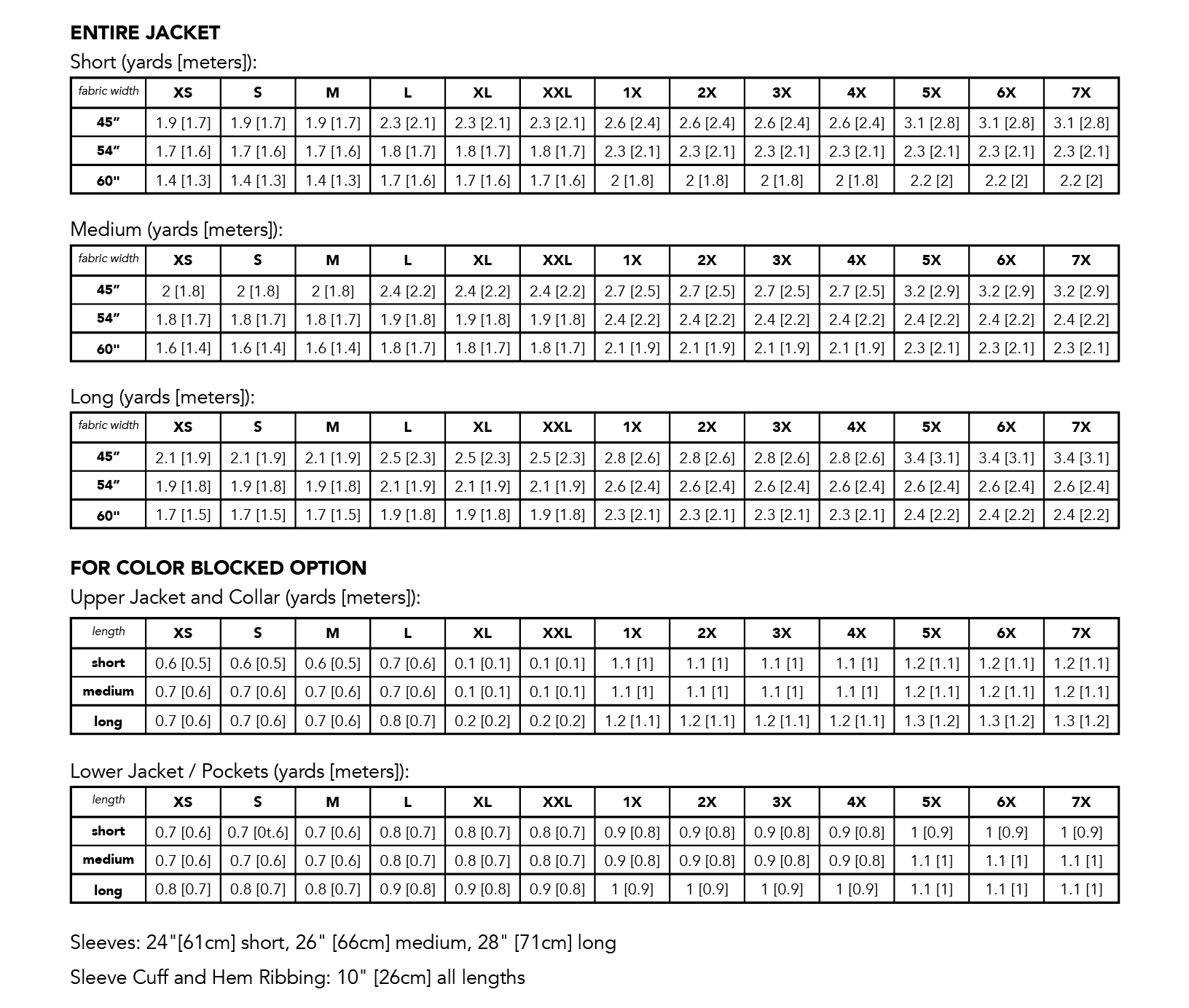 SUGGESTED FABRIC: This jacket is designed for knits with at least 20% cross grain stretch. French terry, sweatshirt fleece, ponte, and other sturdy knits are ideal for this pattern. Knits that are really drapey are not suitable for this pattern.