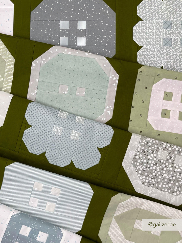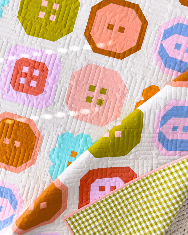 The pattern consists of five various button blocks (all finish 10" square) that are arranged randomly throughout the quilt. The 21-page pattern includes tags for organizing your cuts of fabric, downloadable coloring pages, detailed instructions, and colorful diagrams.
