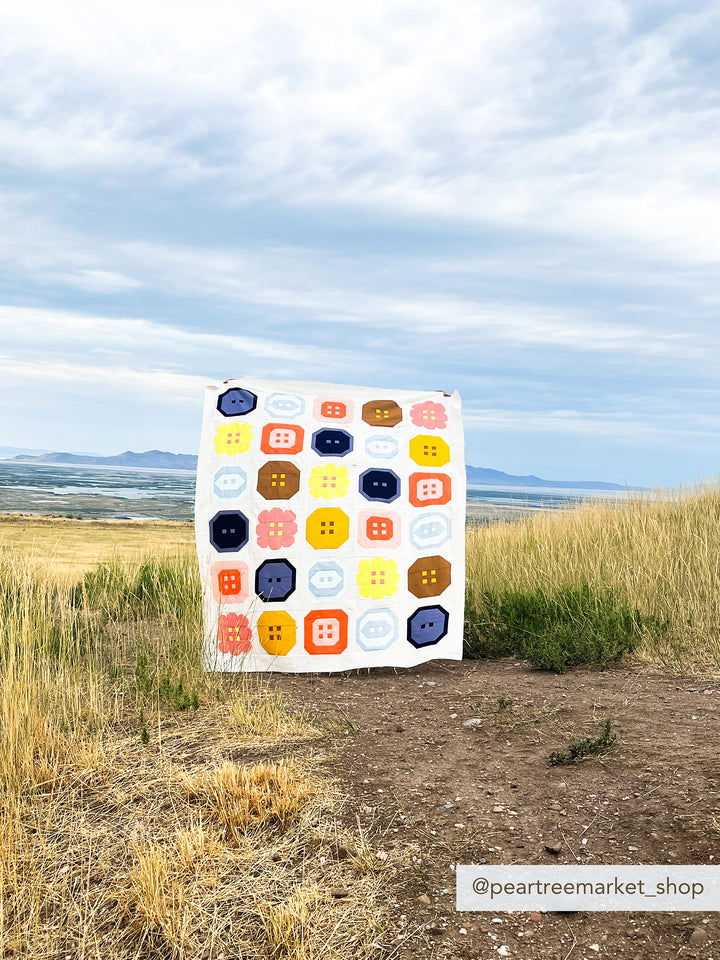 Buttoned Up is a traditionally pieced quilt recommended for the confident beginner sewist & up! The pattern includes instructions for making a large throw size (65 1/2" x 77 1/2") and a small throw size (53 1/2" x 65 1/2"). Buttoned Up includes a bonus Heart Button block pattern as well! You can incorporate the block in your quilt top or use it for small projects such as mini quilts, tote bags, and pillows!