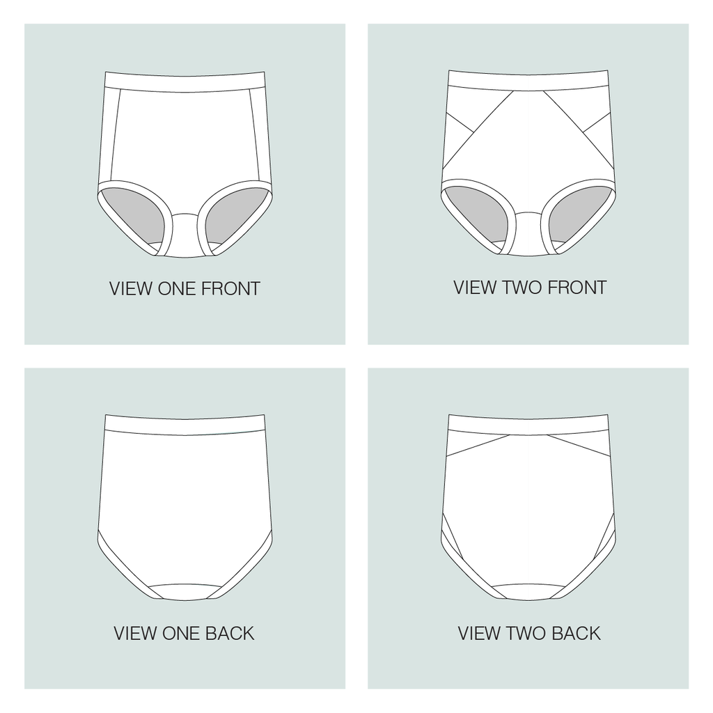 GARMENT SPECIFICS The Median Knickers are high waist, full coverage undies. View one has super simple, classic seamlines, and view two has geometric design lines that are perfect for color blocking, sheer panels, or trim insertion. The crotch is cut wide to always stay in place, is fully lined, and uses a great trick to enclose all the seams.