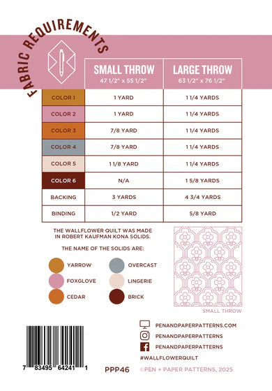 Meet Wallflower - A quilt pattern designed to capture the nostalgic charm of retro floral wallpaper. This traditionally pieced quilt is perfect for intermediate quilters and beyond. The pattern includes instructions for making two quilt sizes - Small Throw (47 1/2" x 55 1/2") and Large Throw (63 1/2" x 76 1/2"). The 24-page pattern is complete with labels for organizing your fabric, coloring pages, and detailed step-by-step instructions & diagrams.