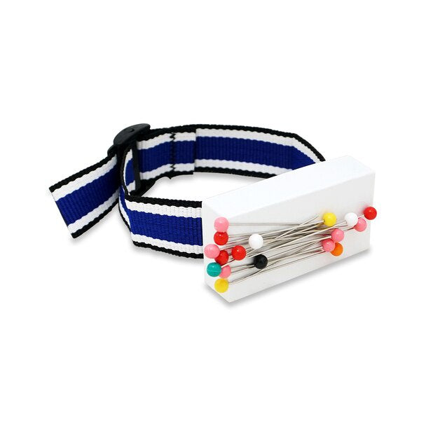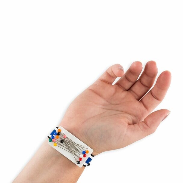 Wrist Grabbit magnetic pincushion keeps pins as close as your hand. The powerful magnetic platform on a wrist band sweeps up pins and aligns them with the heads ready to grab. Whether hemming or fitting, pins are ready at your fingertips!