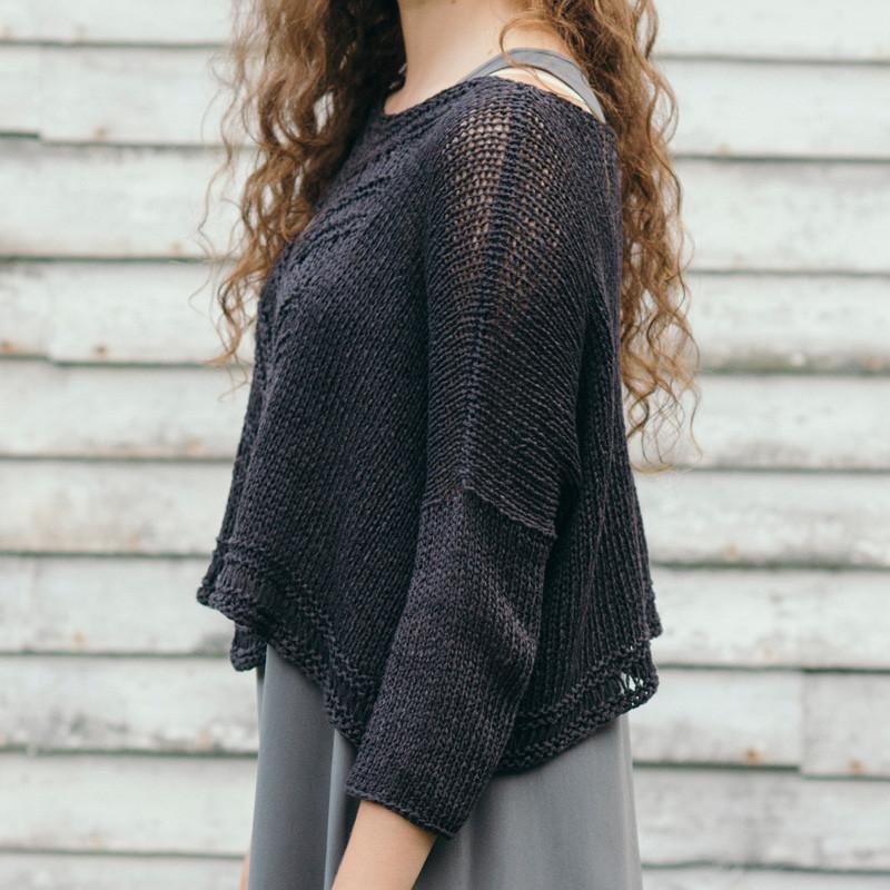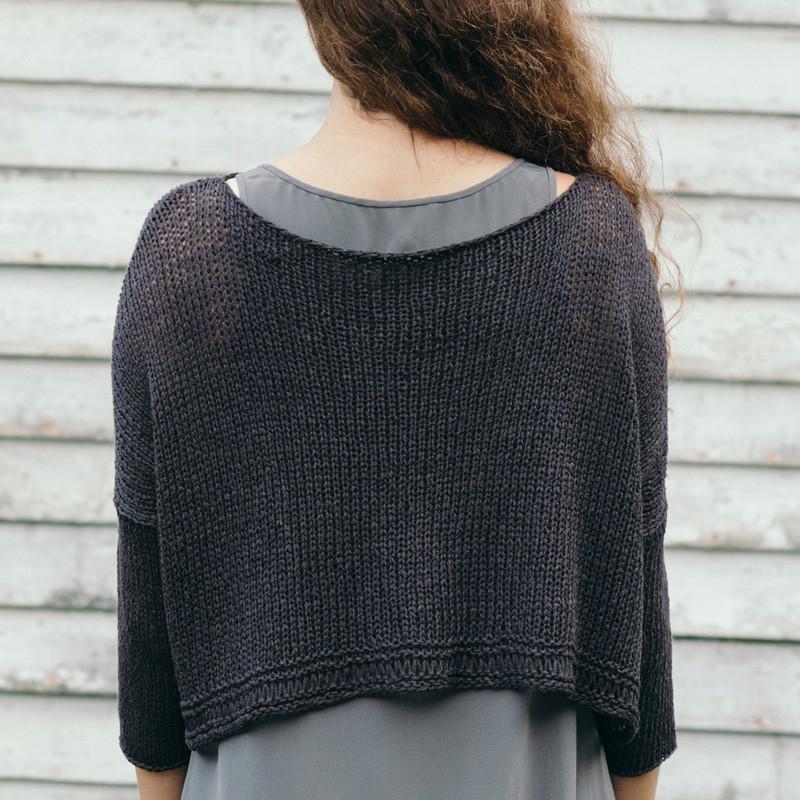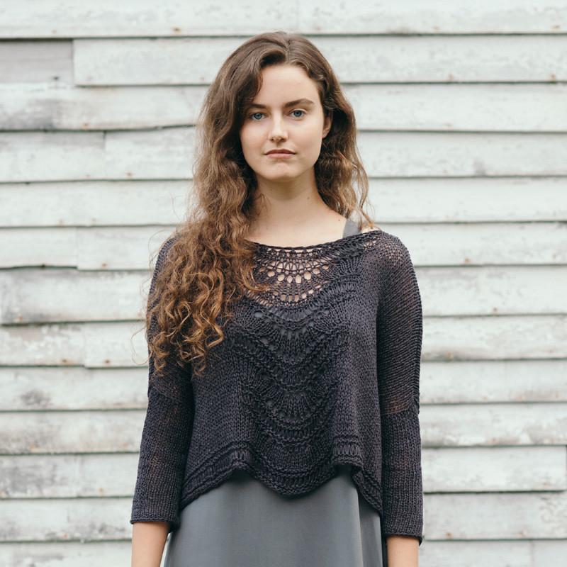 The chained ribbon structure of our Kestrel linen creates striking textured lace, the focal point of Deschain by Leila Raabe. Designed with plenty of ease for a relaxed fit, this cropped boxy pullover is worked flat and then seamed, with slim sleeves picked up and worked in the round down to the cuff. Dropped stitches update the classic shale lace motif gracing the body’s front and hem.