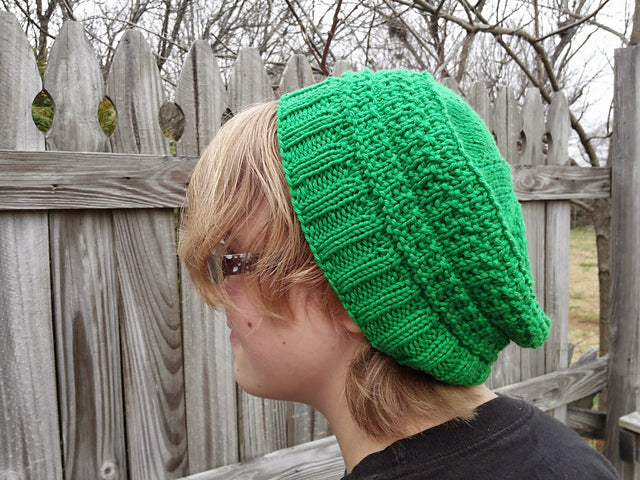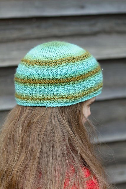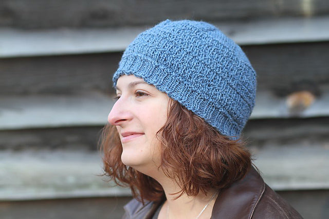 This is a top-down hat. It can be ended when the yarn does if necessary; the pattern has sufficient purls in it that it doesn’t curl. A shorter hat will be a cap; a longer one can cover the ears for warmth; an even longer one can be slouchy. Knit the crown and some ribbing in a contrast color if desired.