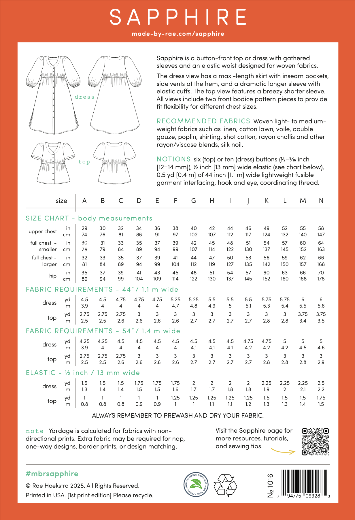 Sapphire is a button-front top and dress with gathered sleeves and skirt designed for woven fabrics. The dress view features a maxi-length skirt that includes inseam pockets and side vents at the hem. Choose a shorter sleeve or longer sleeve with elasticated cuff. The facings can optionally be attached on the outside of the garment for a fun pop of contrast. Two front bodice pattern pieces are provided - for fuller and smaller chests - to provide fit flexibility for different busts.