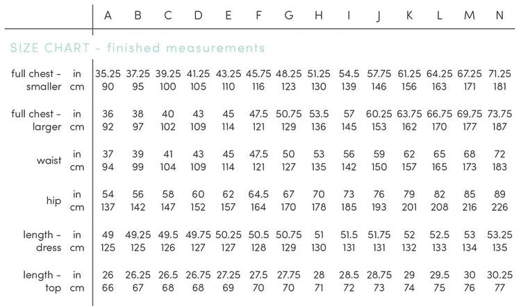 Use the finished measurement chart to determine how much ease you will have through the chest and hip for the size selected by subtracting your measurements from the finished measurements for that size. At least 2 inches [5 cm] for chest and 4 inches [10 cm] for hip is recommended. To achieve the desired amount of ease for your body, go up/down a size, trace between sizes, or blend sizes when your tracing pattern pieces, if necessary.